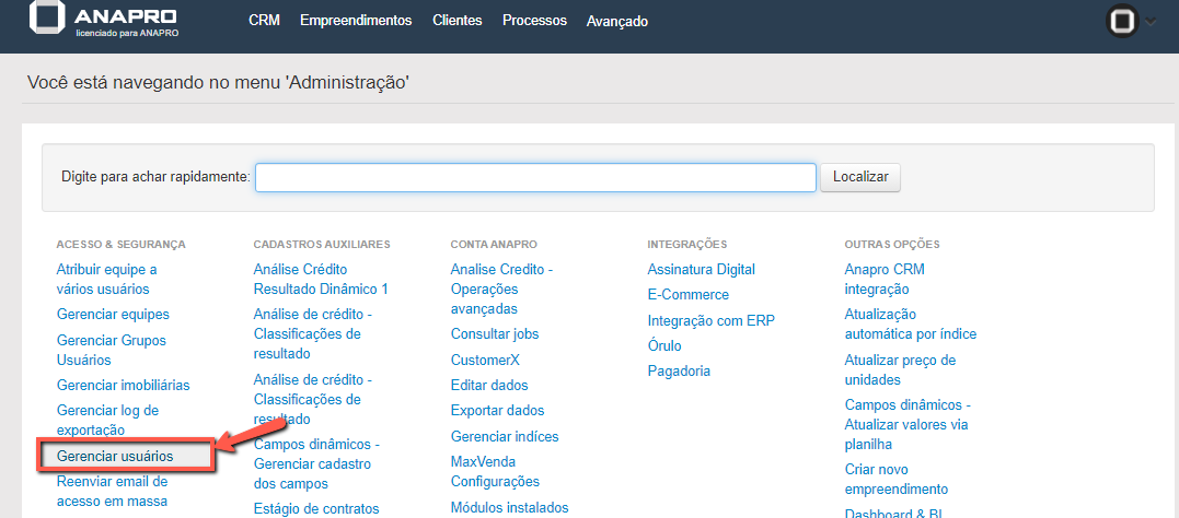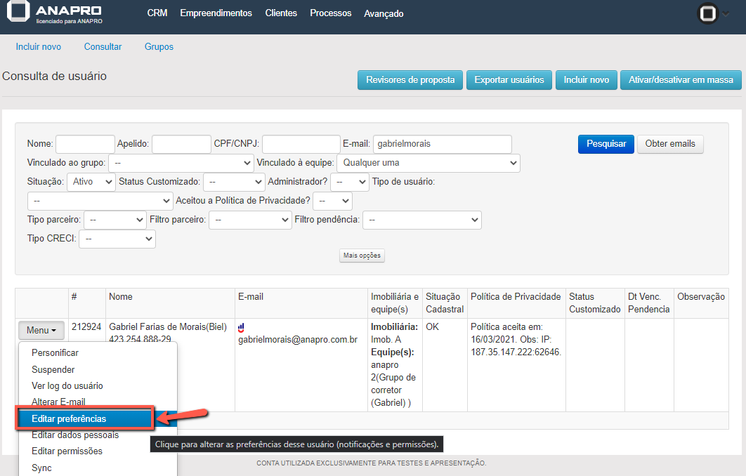Em gerenciar usuários, você terá os campos para buscar o usuário que deseja. Localizando o mesmo, clique no menu "Editar preferências".