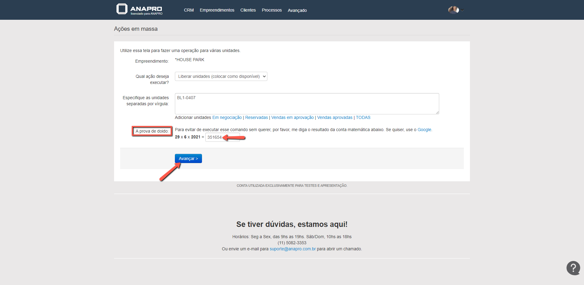 - As unidades devem ser descritas exatamente iguais na consulta de unidade. Caso esteja "BL-101", no campo abaixo deve estar da mesma forma.
