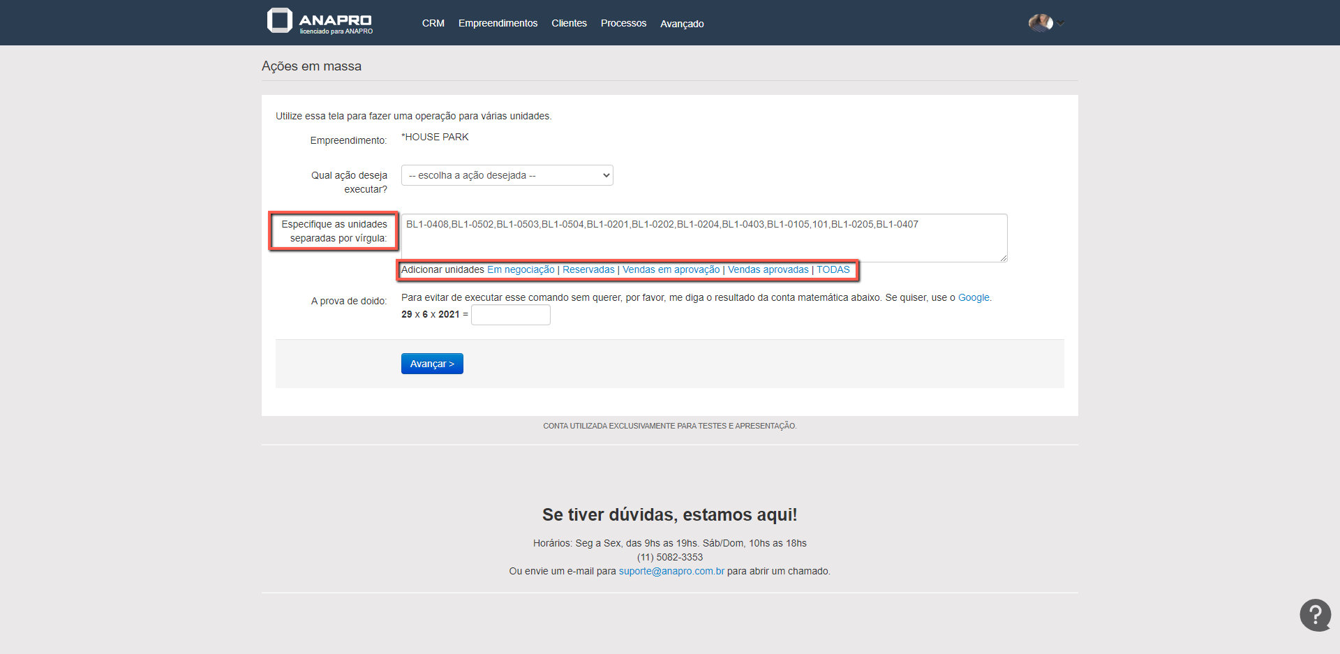 Depois de escolher a ação que deseja executar, basta informar as unidades que deverão sofrer as alterações.