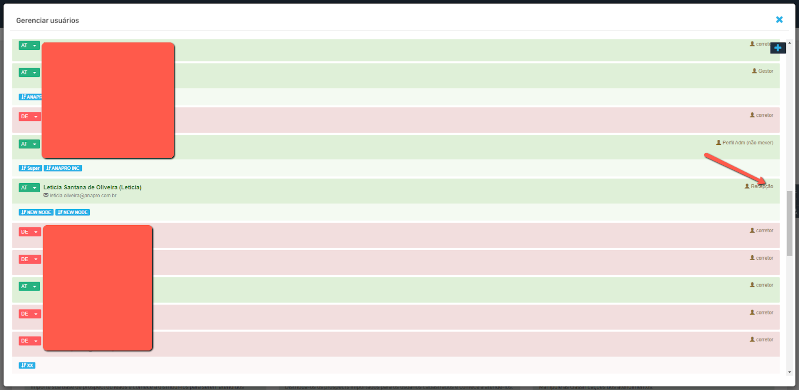 Ao abrir a página, vamos localizar o usuário que desejamos alterar o perfil e clicar em cima do perfil atual deste usuário.