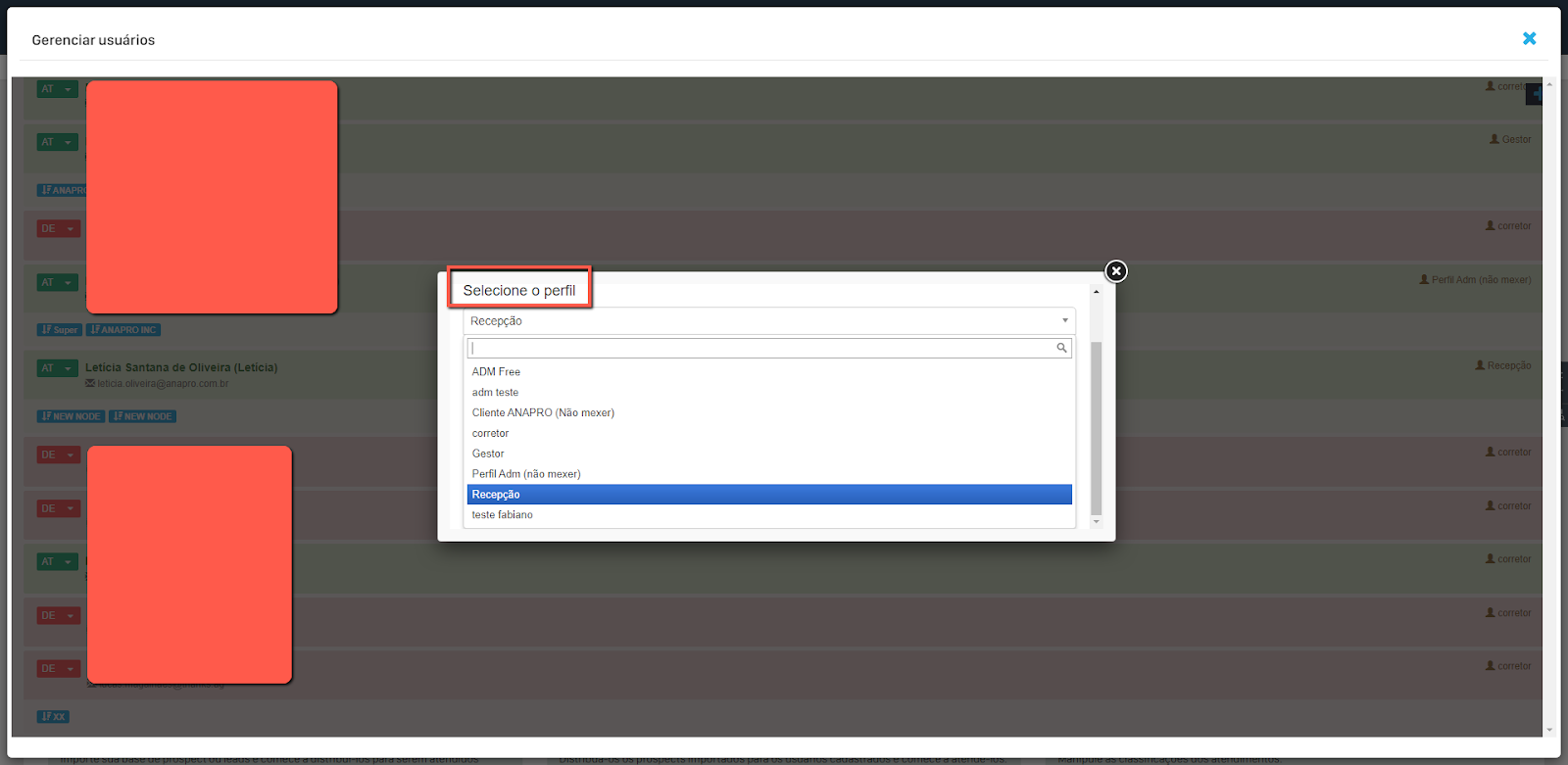 Será exibida uma lista dos perfis disponíveis. Clique no novo perfil desejado e, em seguida, clique em salvar. Pronto, o perfil do usuário será atualizado.