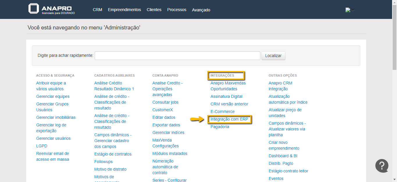 Tela inicial da instância > Avançado > Administração > Integração com ERP