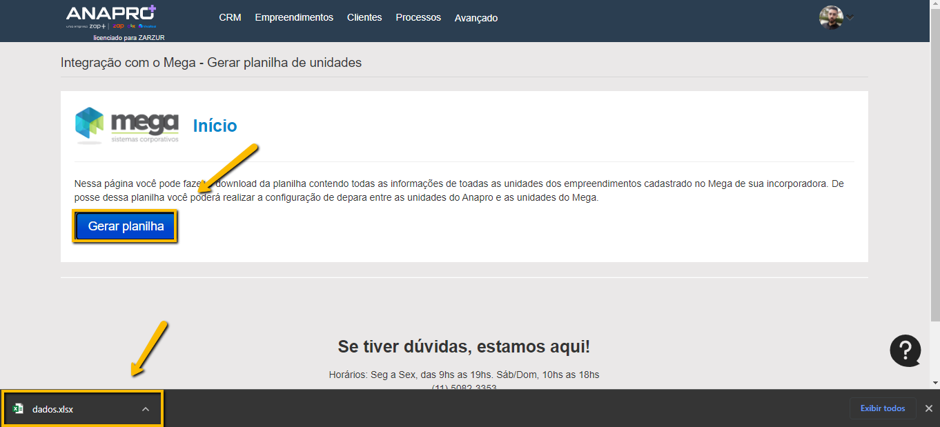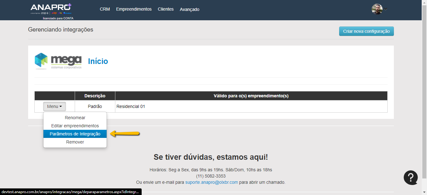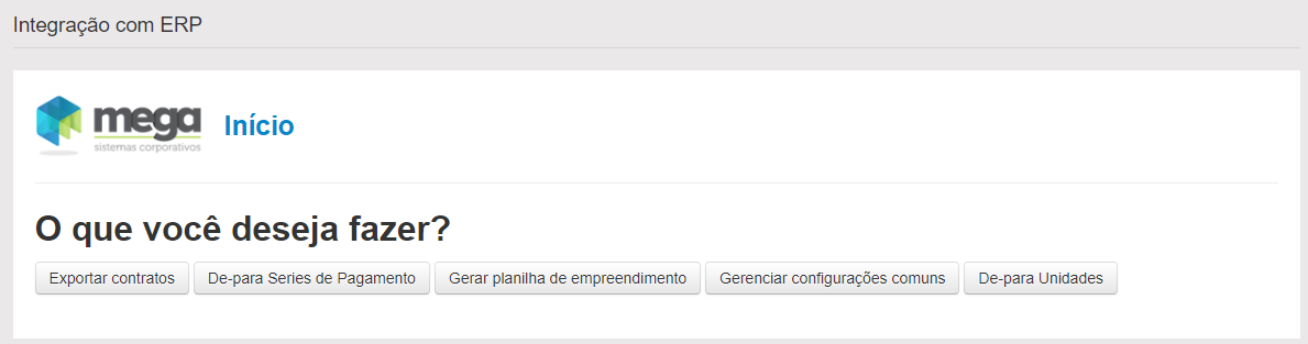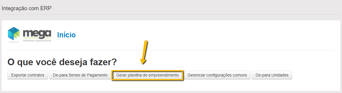 De-para de unidades | Não é necessário solicitar informações ao cliente. Os dados do empreendimento são obtidos pelo botão "Gerar Planilha de empreendimento" no painel de funções da integração.A integração com o ERP MEGA, nós não precisamos solicitar informações de de-para para o cliente, pois puxamos os dados do empreendimento através do botão "Gerar Planilha de empreendimento" que possui no painel de funções da integração na instância do cliente. |