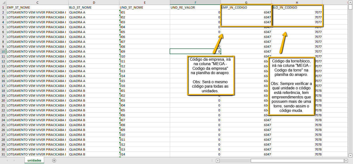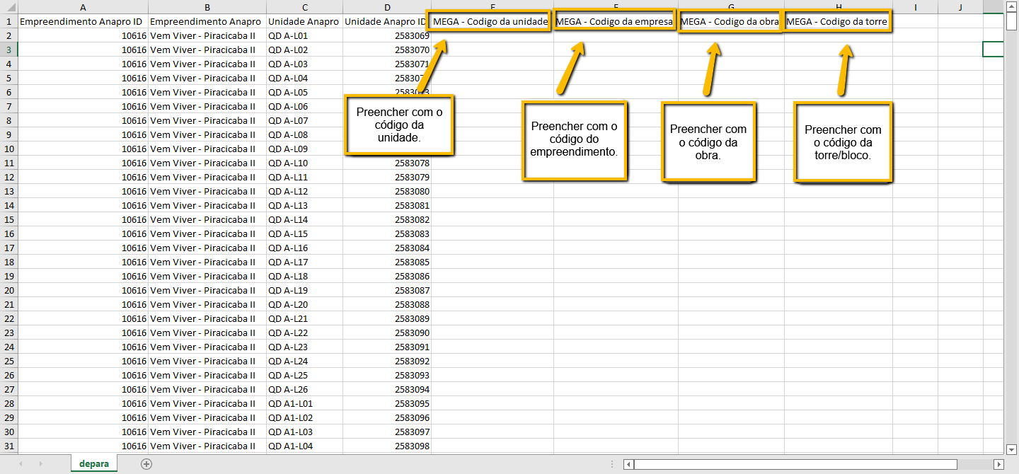 1 - Gerar planilha de empreendimento com as informações necessárias para realizar o de-para de unidades.