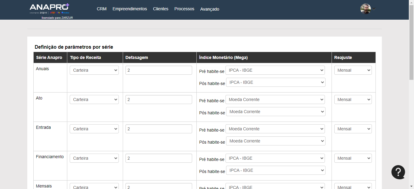 Configurações comuns | Definirá as configurações das series como, tipo de receita, defasagem, índice Monetário e o reajuste se ele será mensal ou anual. Essa configuração ela pode ser feita uma por empreendimento caso cada empreendimento tenha uma particularidade nas series ou uma que englobe todos os empreendimentos. |