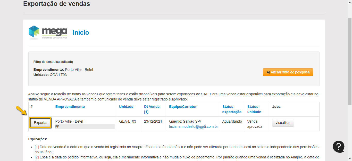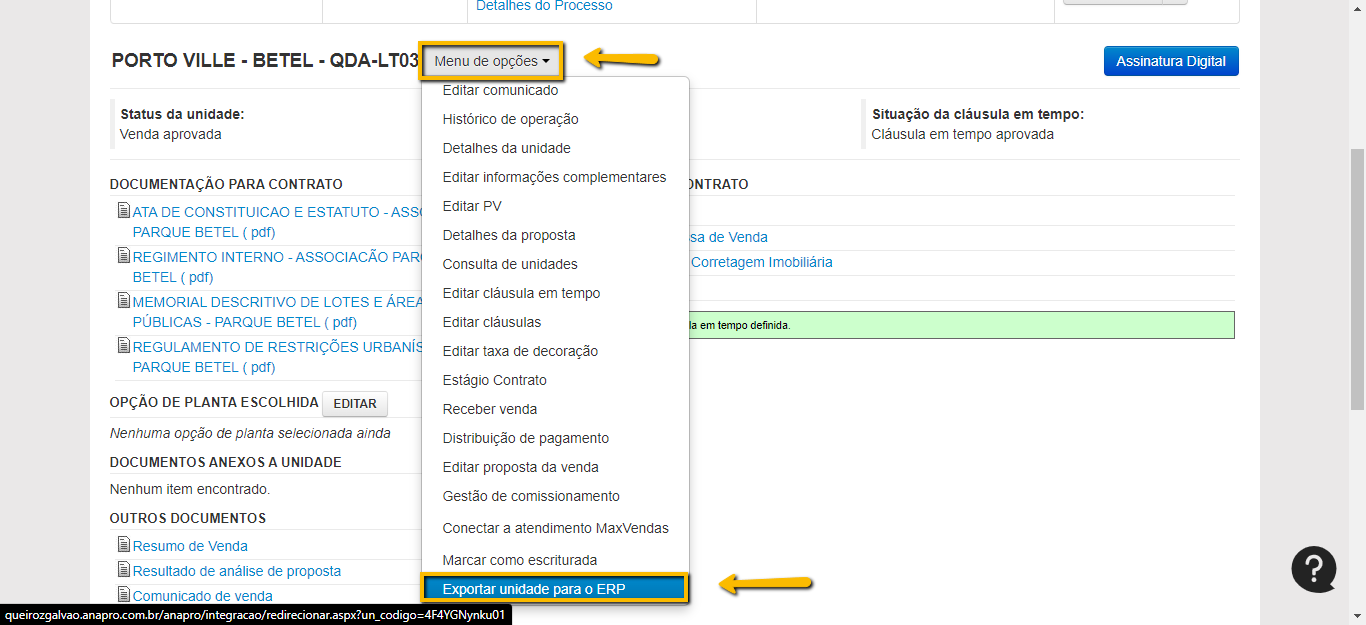 Primeiro a unidade negociada precisa estar com a venda aprovada, feito isso seguir passo a passo dos prints abaixo para exportar a venda para o MEGA: