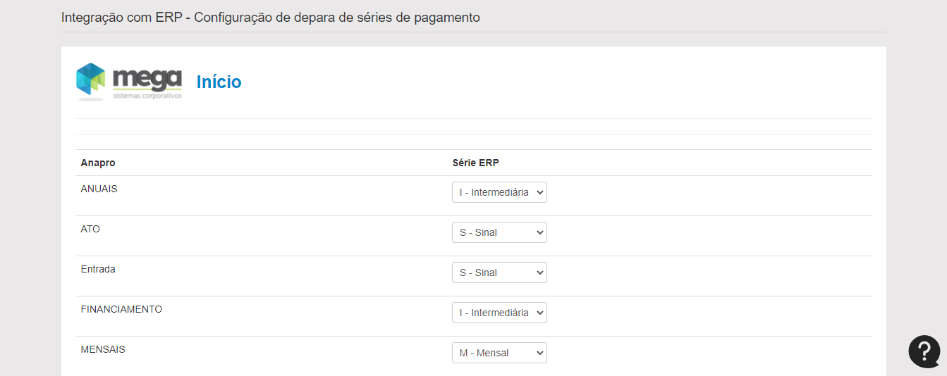 De-para Séries de Pagamento | No de-para de series de pagamento não precisamos solicitar nenhuma informação para o cliente. A integração mostrar as series que estão cadastradas na base do MEGA do cliente, basta apenas relacioná-las com as do anapro. Caso os nomes estejam diferentes, configurar de uma forma genérica apenas para teste e verificar na validação final juntamente ao cliente. |