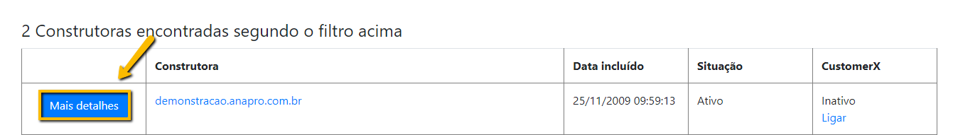 4 - Acessar a aba "Construtoras", você irá pesquisar pelo nome da construtora ou URL da instância:
