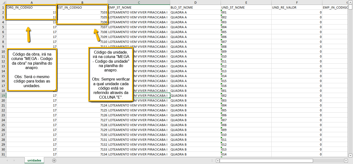 Primeiro print é referente a planilha do ANAPRO, segundo print é referente a planilha geramos através do "Gerar planilha de empreendimento" que o cliente nos envia.