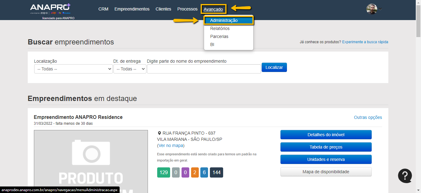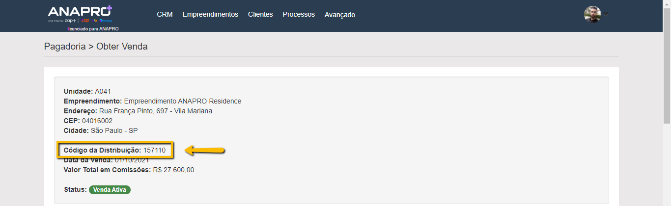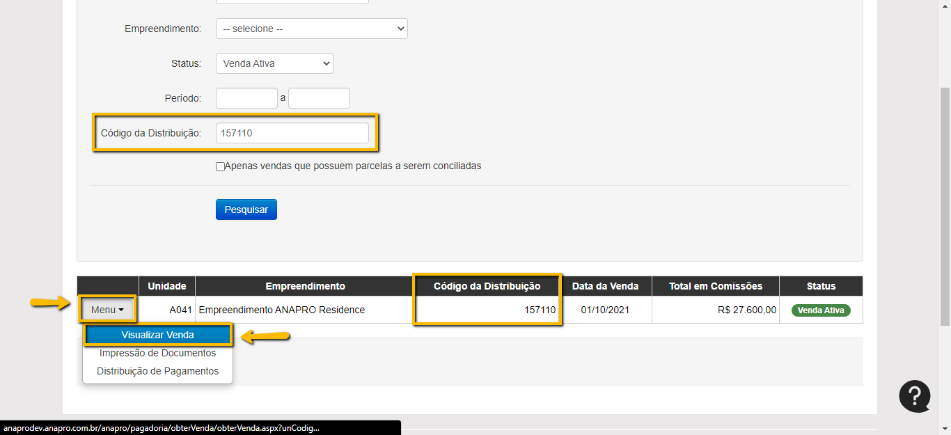 Observação: Identificar a venda através do código de distribuição só será eficiente caso você saiba o código, caso o contrário utilizar os filtros normais de "Unidade" e "Empreendimento".