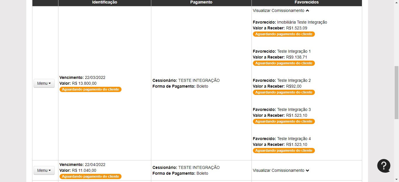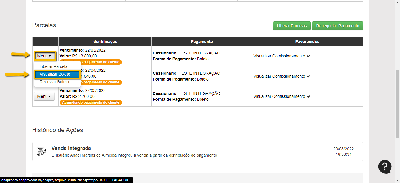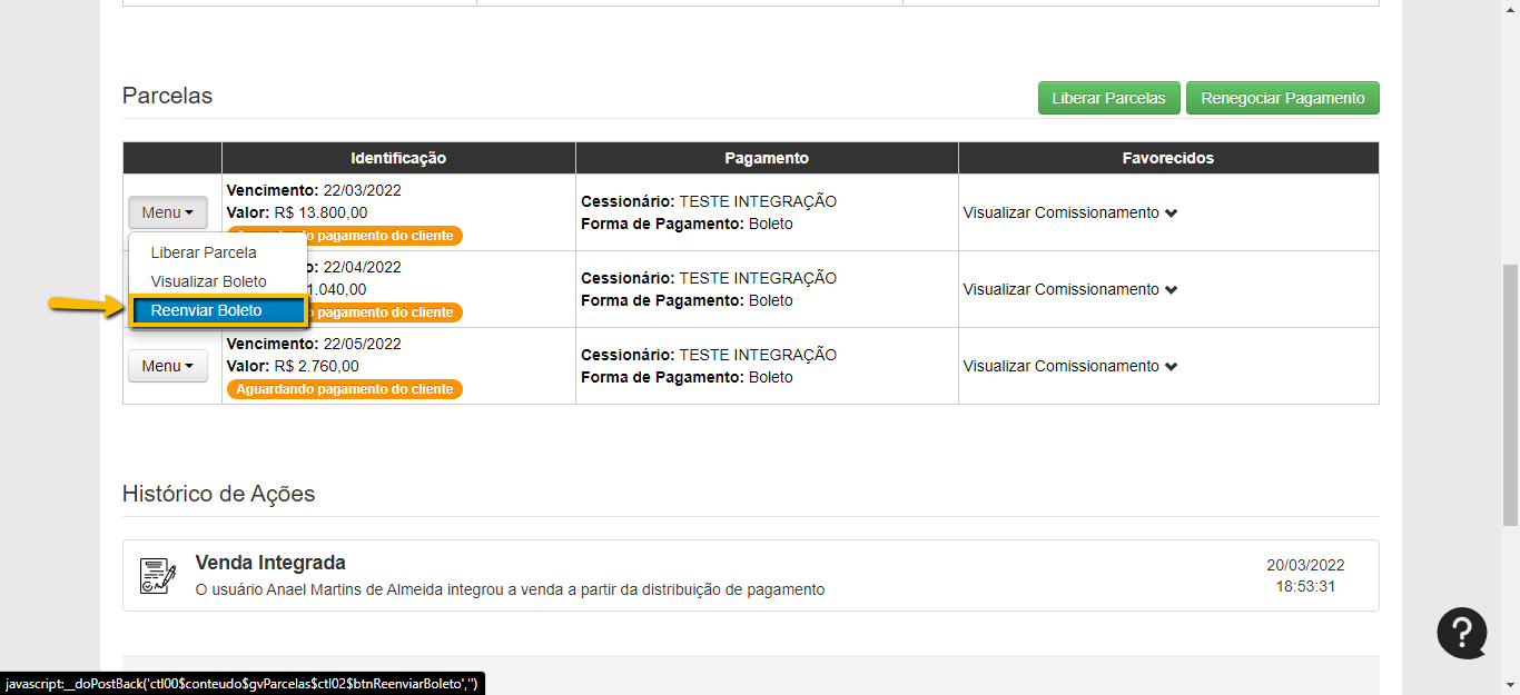 - Na tela das parcelas conforme a imagem abaixo, temos o botão "Menu", nele veremos o botão "Liberar Parcela", "Visualizar Boleto" e "Reenviar Boleto".