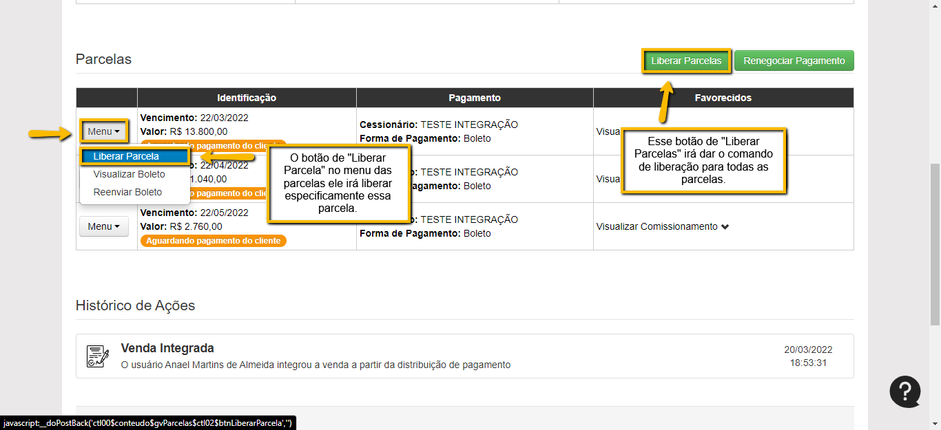 Observação: Prestar atenção na nota da imagem explicando a diferença entre os dois botões de "Liberar Parcela" que existe.
