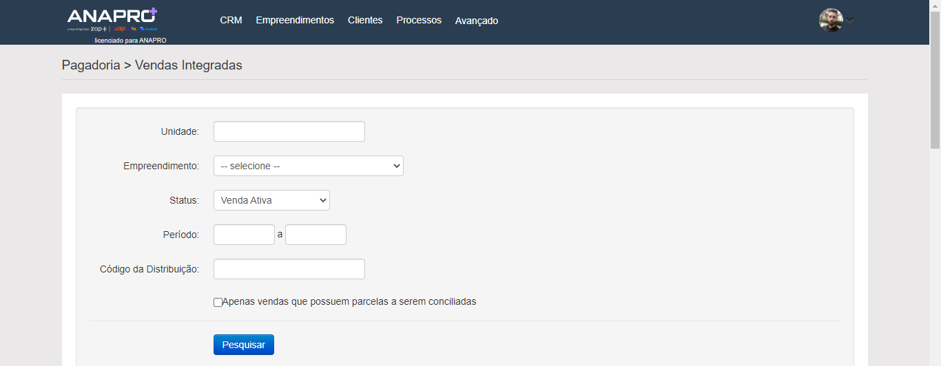 - Ao clicar no botão "Vendas Integradas" irá abrir uma tela com alguns filtros para localizarmos a venda integrada na pagadoria.