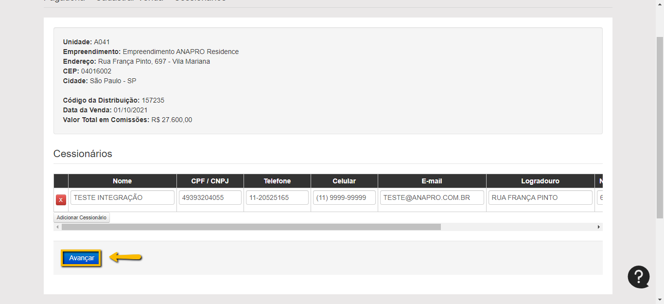 - Após clicar em "Cadastrar Venda" será aberto a seguinte tela conforme a imagem abaixo com os dados do(s) cessionário(s) (cliente(s)), e os dados do empreendimento. Depois de conferir os dados do cliente basta avançar.