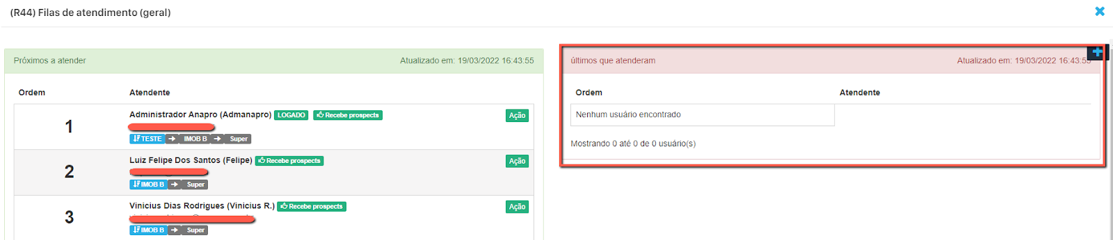 No lado direito da tela, você poderá visualizar, em tempo real, dados sobre os últimos usuários que realizaram atendimentos — tudo isso sem precisar atualizar a página.