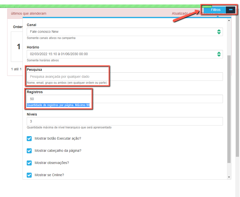 Ao aumentar a quantidade de exibição, o relatório mostrará todos os usuários vinculados aos canais de atendimento da campanha filtrada.