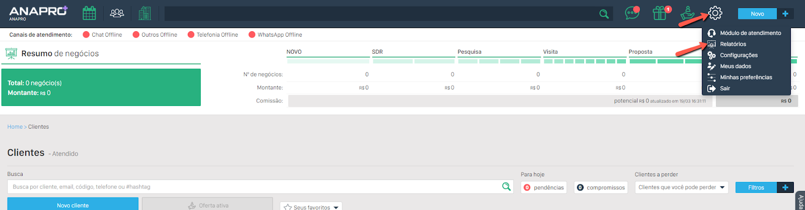 Acesse o menu clicando no ícone de engrenagem. Em seguida, selecione a opção "Relatórios".