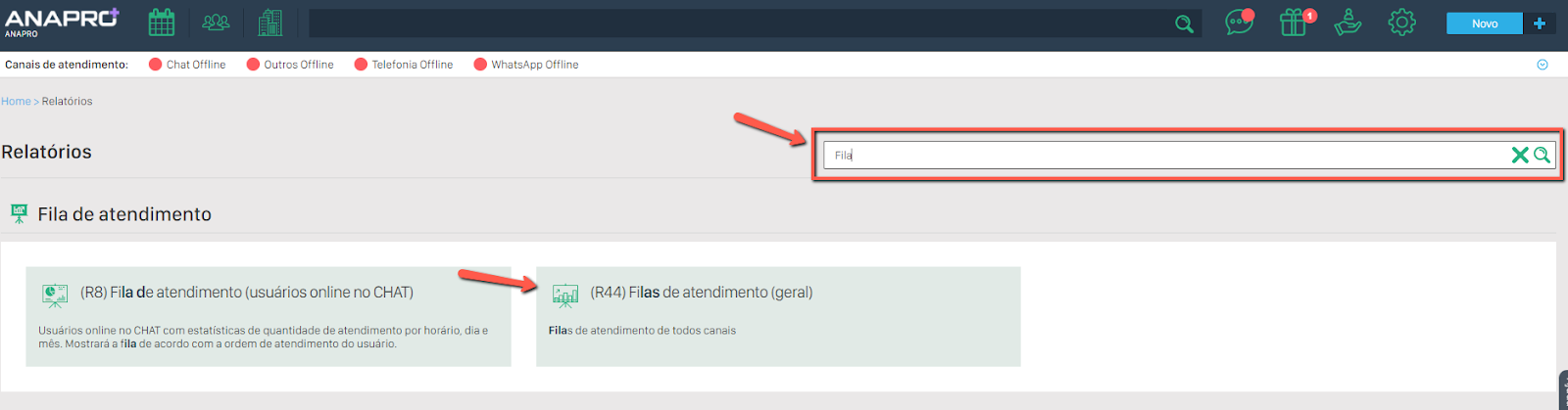 Após acessar a área de relatórios, você verá a lista completa de relatórios disponíveis no sistema, junto com um campo de busca no topo da tela. Digite "FILAS DE ATENDIMENTO" no campo de busca.
