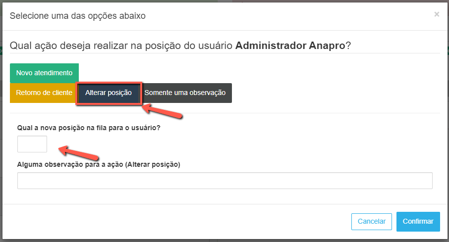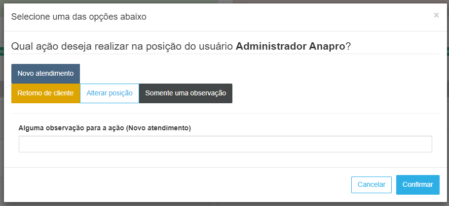 Além de mover o usuário na fila, o sistema também permite incluir uma observação no registro.