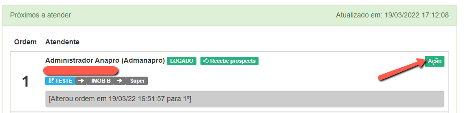 No relatório, também é possível alterar a posição de um usuário na fila de atendimento. Se, por exemplo, um corretor estiver atendendo um cliente presencialmente no stand ou iniciar um novo atendimento fora do sistema, você pode movê-lo para o final da fila para que não receba novos leads nesse momento.