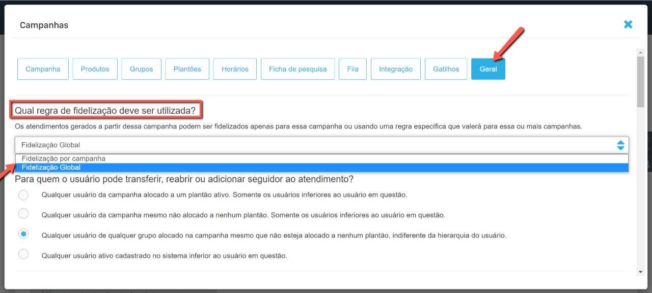 Na última aba, chamada "Geral", localize o campo "Qual regra de fidelização deve ser utilizada?".