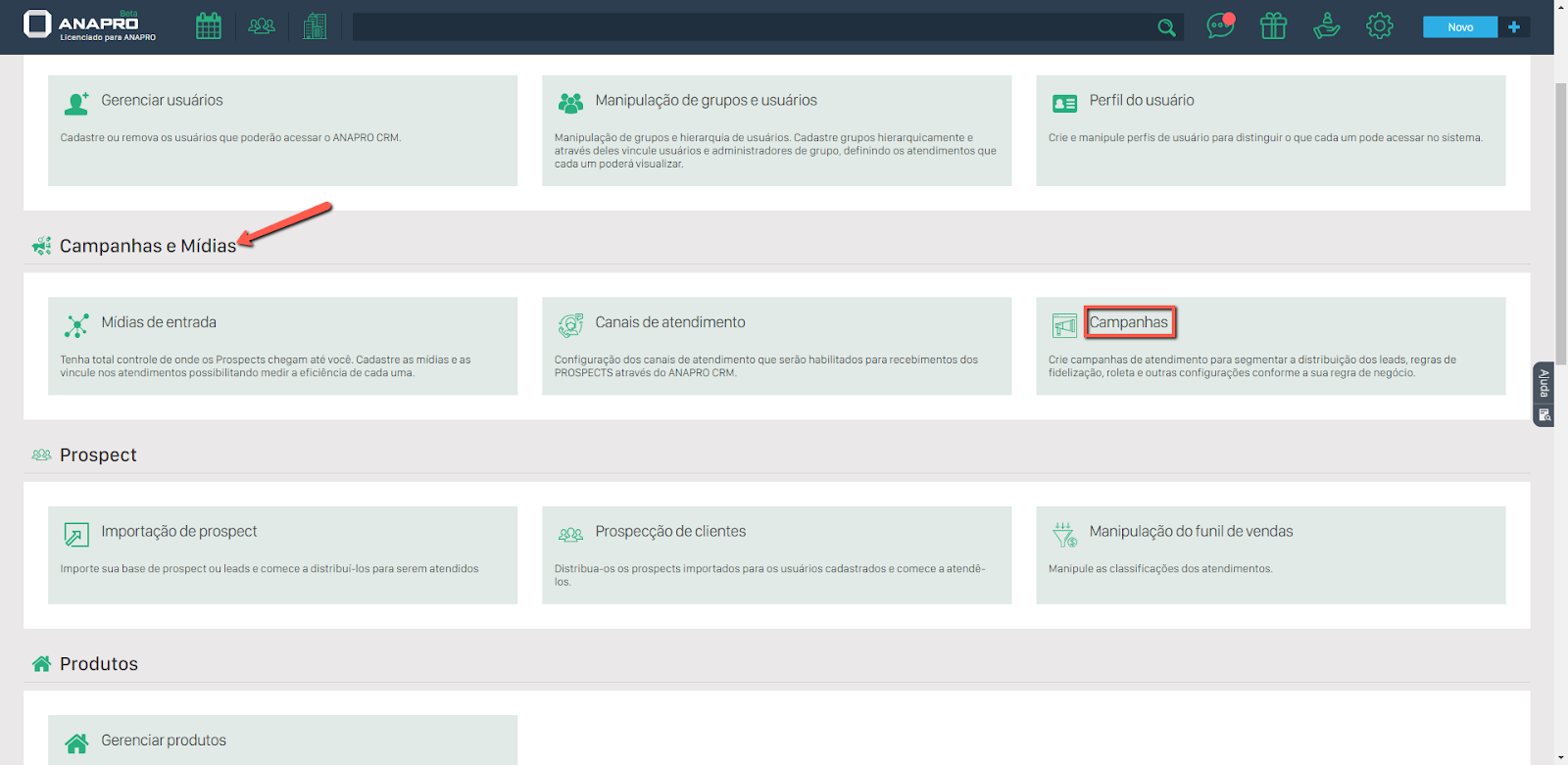 Em seguida, procure por "Campanhas", localizado no bloco "Campanhas e Mídias".
