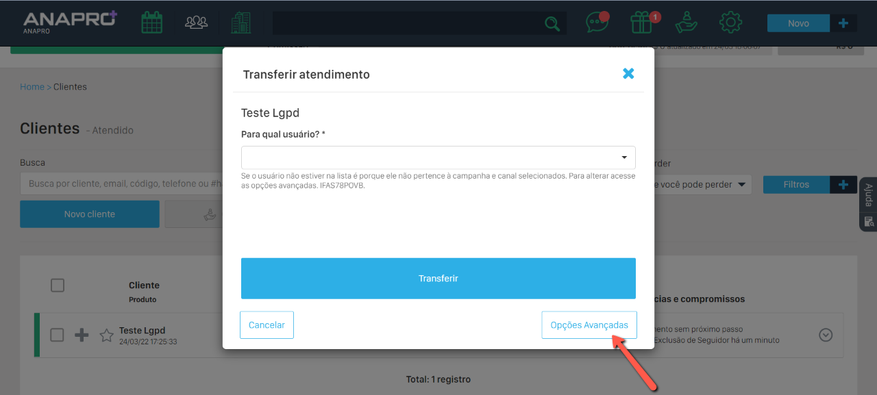 Independentemente de onde você clicar para transferir o cliente (dentro ou fora do atendimento), o sistema sempre direcionará para a mesma página de transferência.
