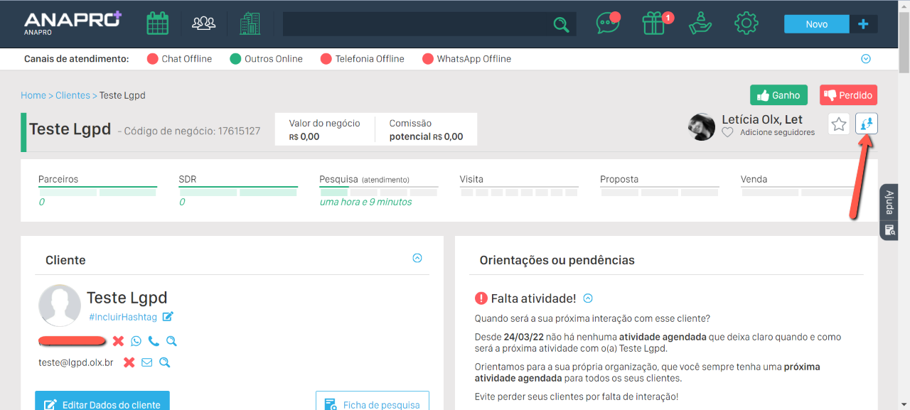 Usuário específico – escolha o colaborador para quem deseja direcionar o lead. Nesse caso, também será possível: