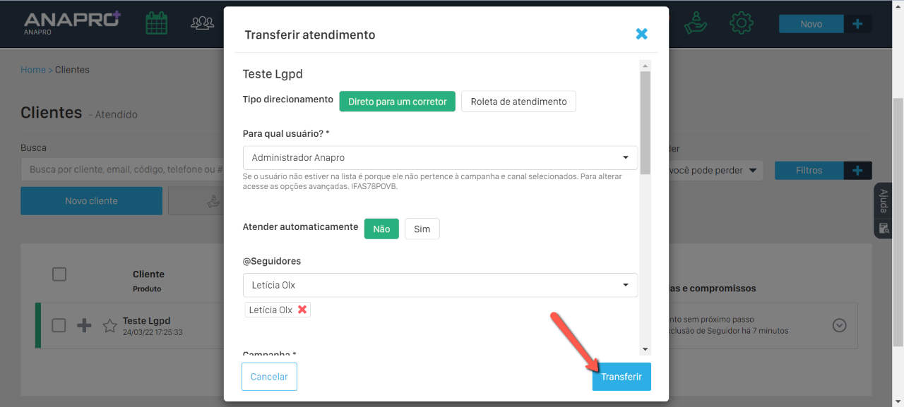 Na próxima página, você poderá determinar se o cliente será direcionado para um usuário específico ou para a roleta. Se a escolha for um usuário específico, você terá a opção de definir se o atendimento será automático ou manual, além de poder adicionar ou remover seguidores, alterar a campanha, o canal e o produto, e incluir observações. Se não houver necessidade de modificar esses dados (campanha, canal e produto), apenas verifique se as informações estão corretas. Após fazer essas definições, clique em "transferir".