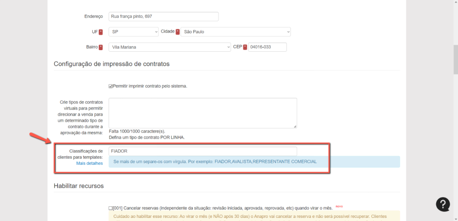 Feito isso vamos descer a página até o campo indicado abaixo, como exemplo vou criar a classificação FIADOR, porem podemos criar qualquer classificação que atenda a necessidade desejada: