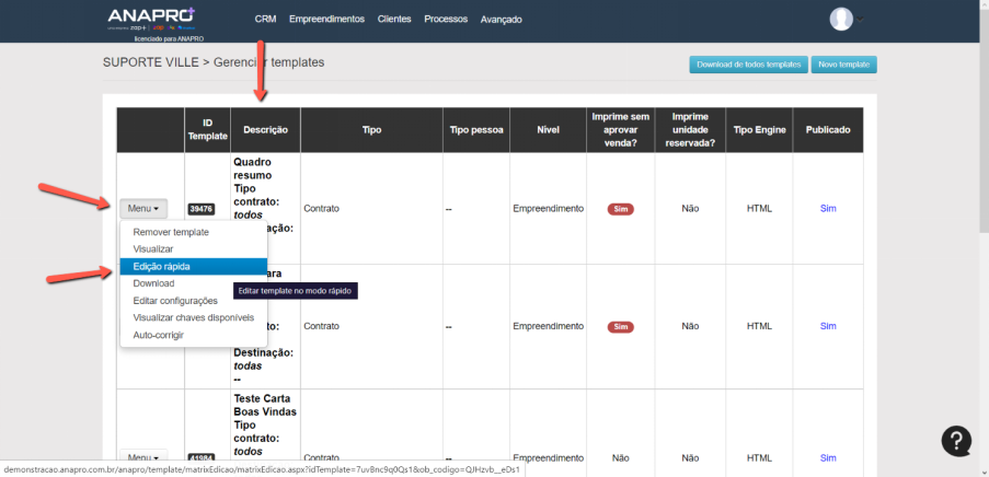 Vamos selecionar o "Template" (contrato), e clicar em Menu > Edição Rápida.