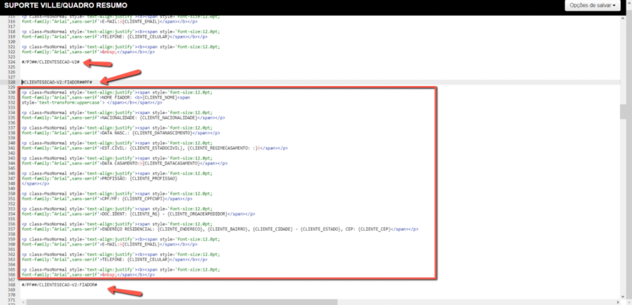 Ao final do #CLIENTESECAO-V2# abrimos um #CLIENTESECAO-V2: FIADOR##PF# (Após o “:” vem sempre a classificação criada no editar cadastro do empreendimento), e um #PF# (isso indica que o Fiador é pessoa física, caso o mesmo seja pessoa jurídica deve se abrir um #PJ#), o que vem abaixo do #CLIENTESECAO-V2: FIADOR##PF# É toda qualificação do cliente e texto de acordo com a necessidade do cliente.