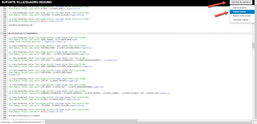 Após editar o template, clique em Opções de Salvar > Salvar Saindo.