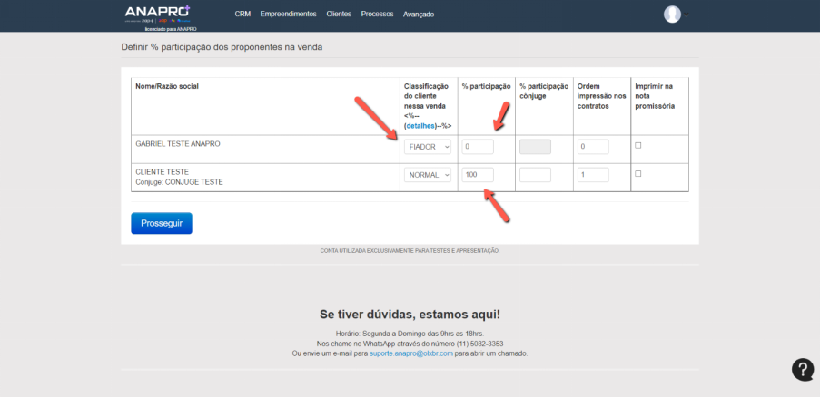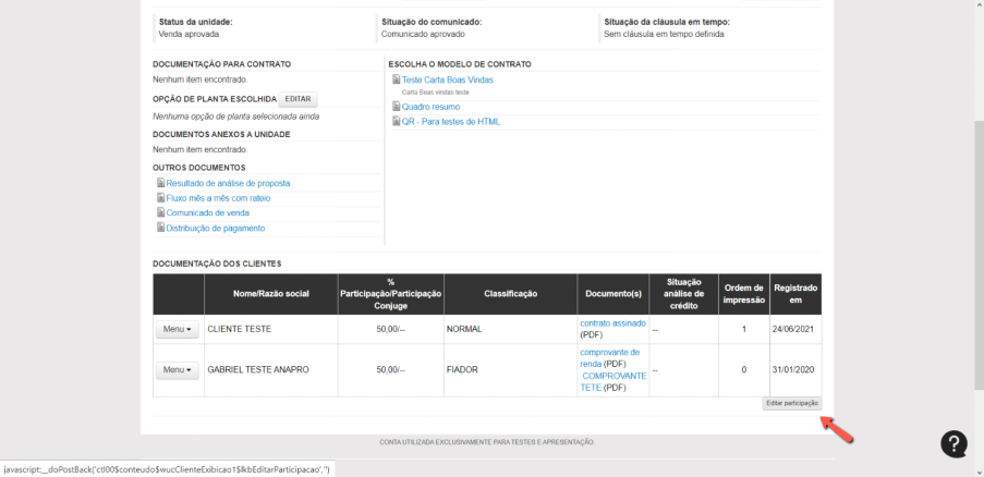 Dentro da "Edição de participação", selecionamos quem é o cliente que vai ser o FIADOR, e qual a porcentagem na venda cada um dos clientes leva.