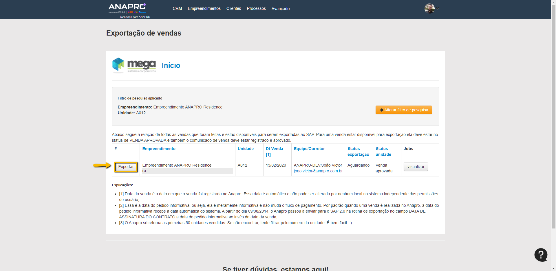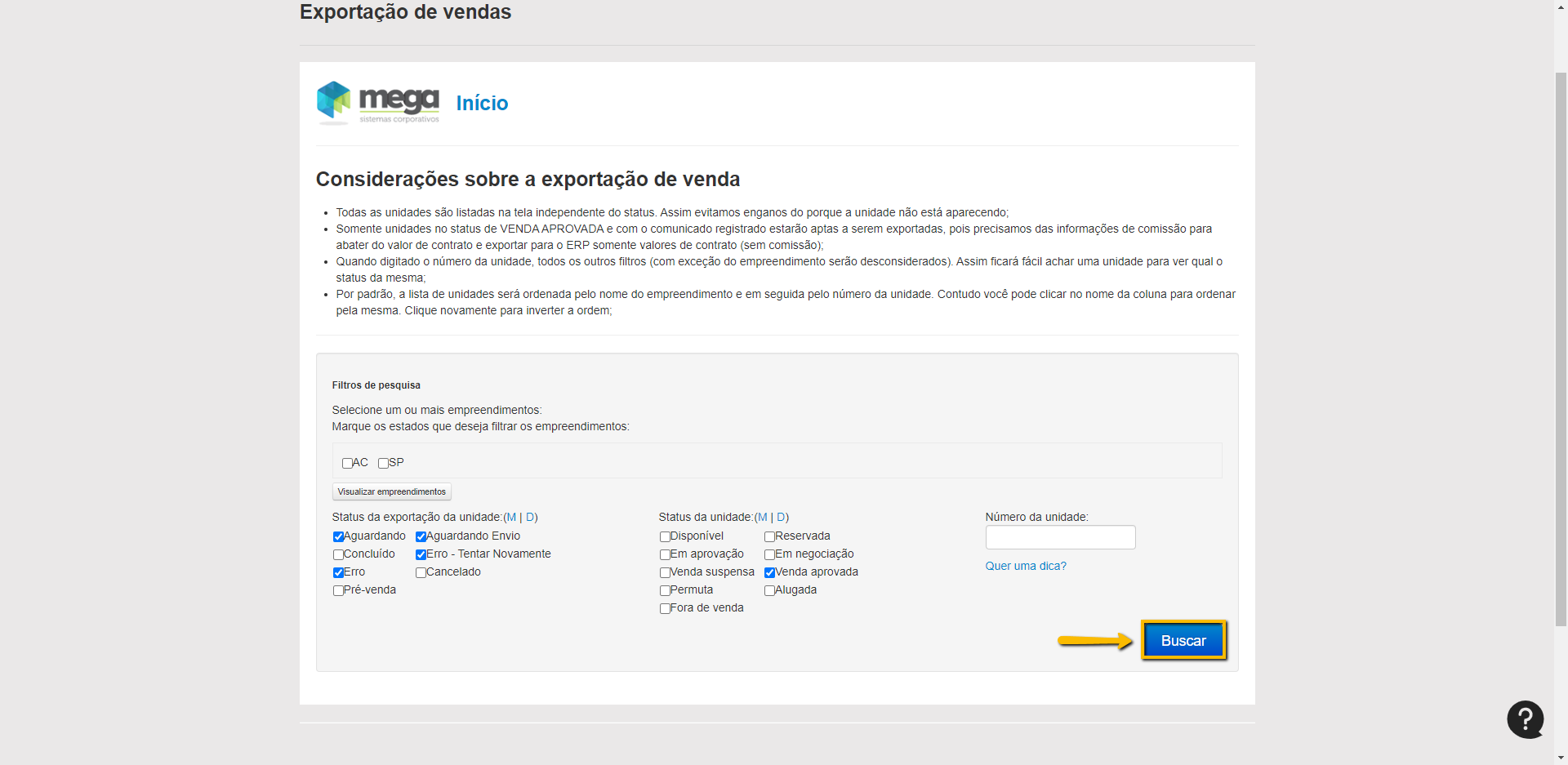 Primeiro a unidade negociada precisa estar com a venda aprovada, feito isso seguir passo a passo das imagens abaixo para exportar a venda para o MEGA: