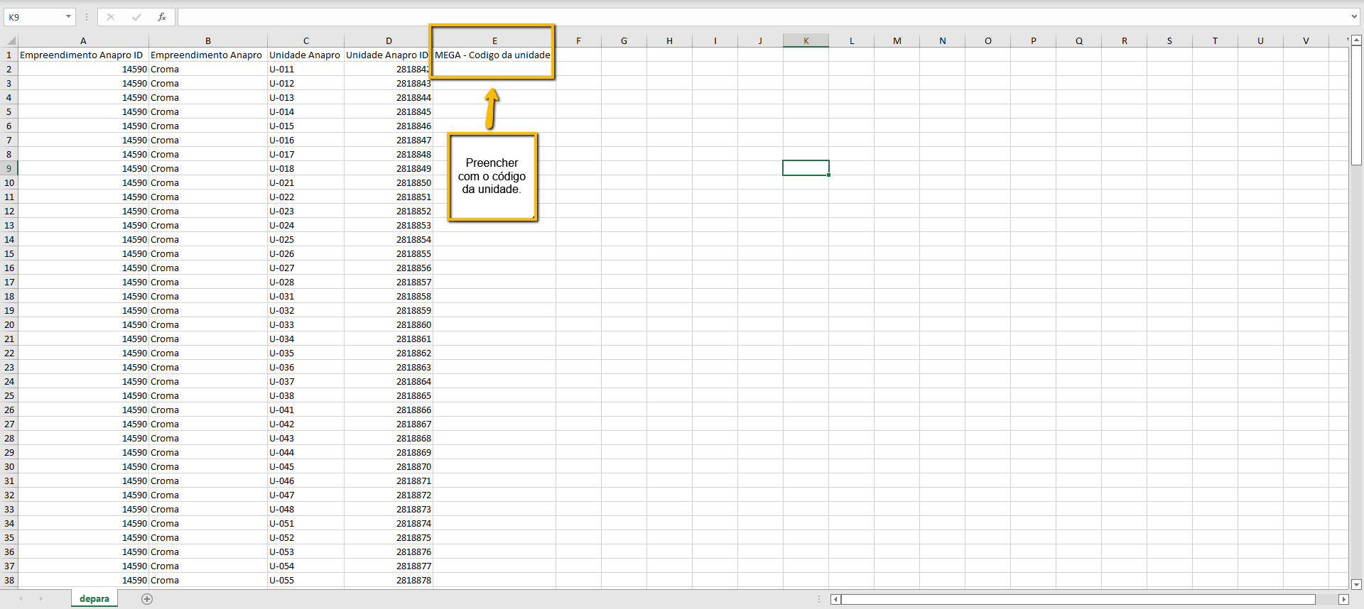2 - Preenchendo planilha de de-para de unidades: