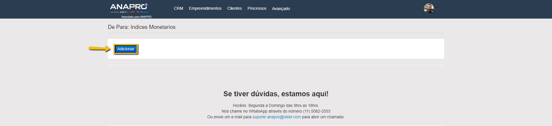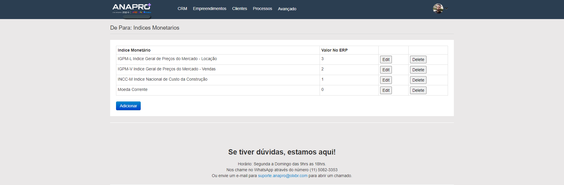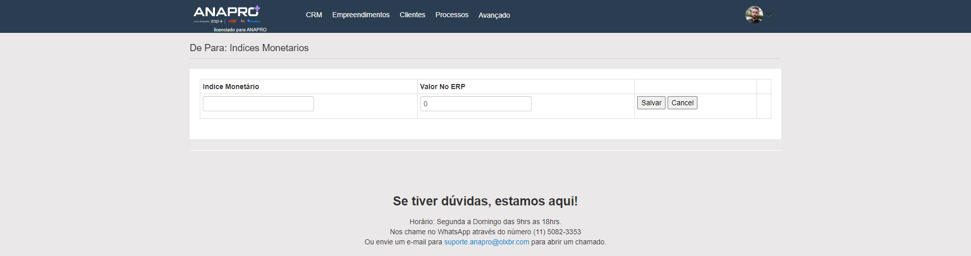 2 - Irá abrir uma tela com o botão "Adicionar", após clicar no botão será apresentado dois campos "Indice Monetário" que você irá colocar o nome do índice e "Valor No ERP" que é o código dele no Mega e logo ao lado possui um botão de "Salvar" e outro "Cancelar".
