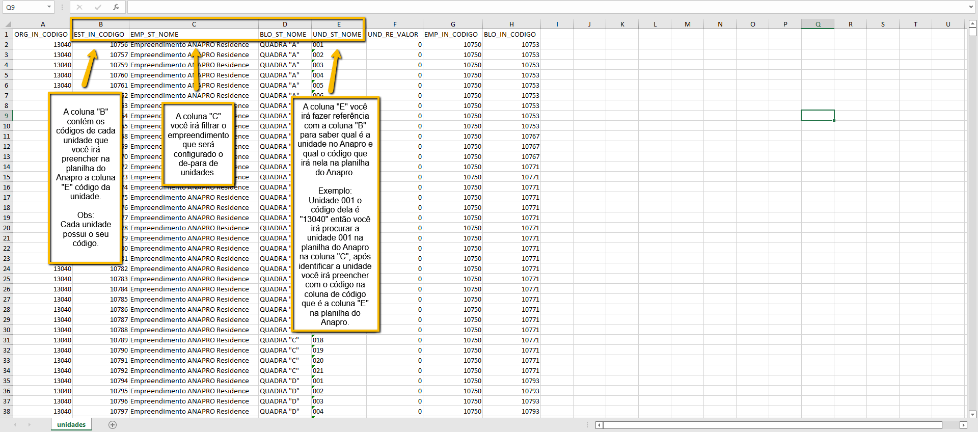 A primeira imagem é referente a planilha do ANAPRO Vendas que geramos conforme instrução do passo 1. Já a segunda imagem é referente a planilha que você irá extrair diretamente no Mega que irá conter os códigos das unidades, para preenchermos na planilha do Anapro Vendas.