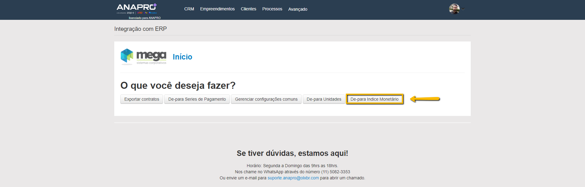1 - No painel de integrações clicar em "De-para Indice Monetário".