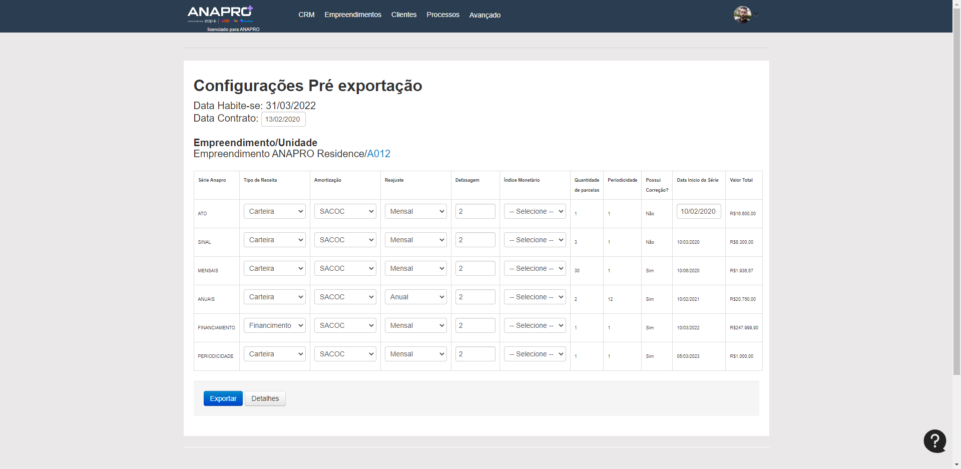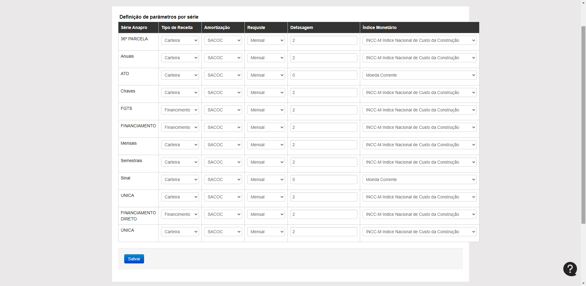 Nas configurações comuns você irá definir alguns parâmetros para as series, como "Tipo de Receita, Amortização, Reajuste, Defasagem e Índice Monetário". Essa configuração ela pode ser feita uma por empreendimento, caso cada empreendimento tenha sua particularidade, ou apenas uma configuração que sirva para todos os empreendimentos.