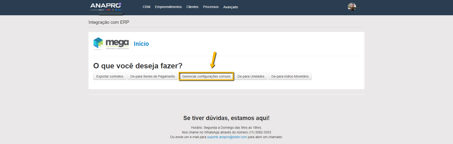 1 - Acessar o painel de integração no Anapro Vendas conforme já foi orientado nas etapas anteriores e clicar em "Gerenciar configurações comuns".