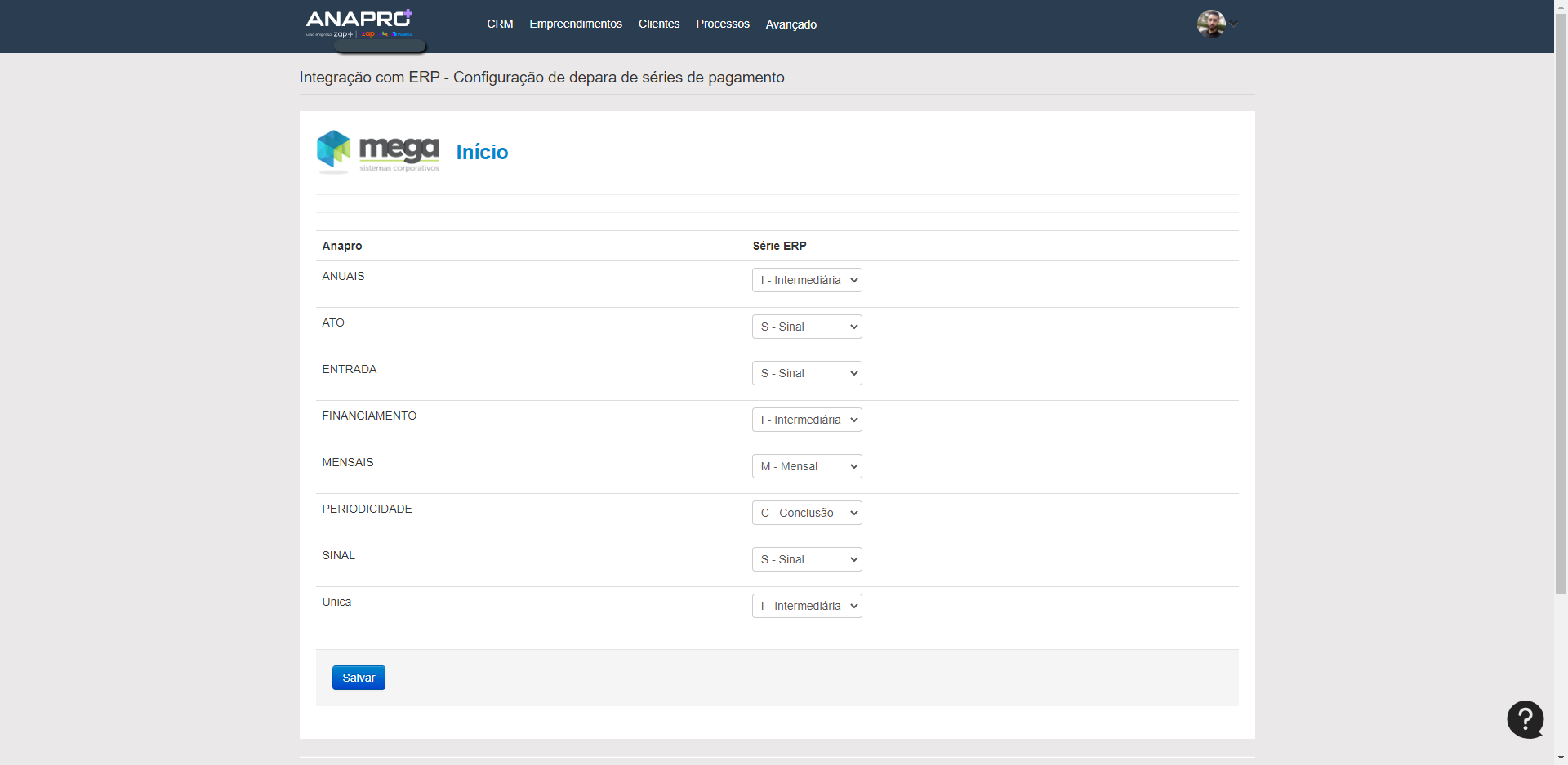 Observação: Quando você entrar na tela de "De-para Series de Pagamento" irá carregar todas as series do Anapro e as que estão cadastrada na base Mega.