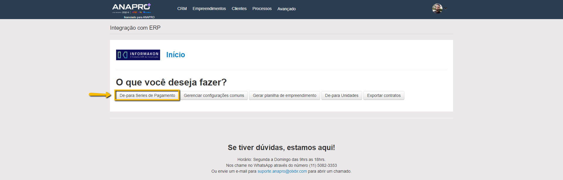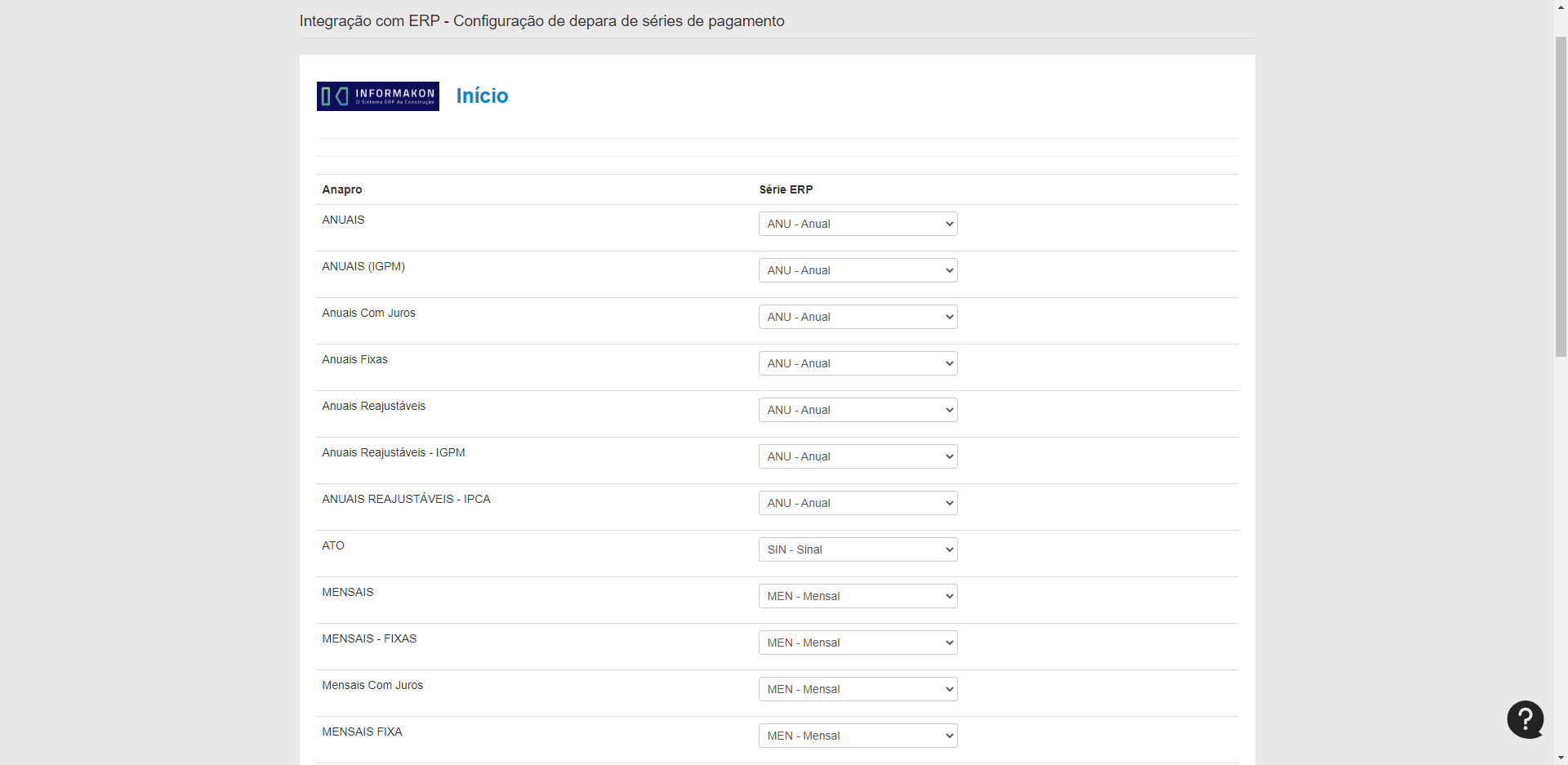 Observação: Quando você entrar na tela de "De-para Series de Pagamento" irá carregar todas as series do Anapro e as que estão cadastrada na base do Informakon.