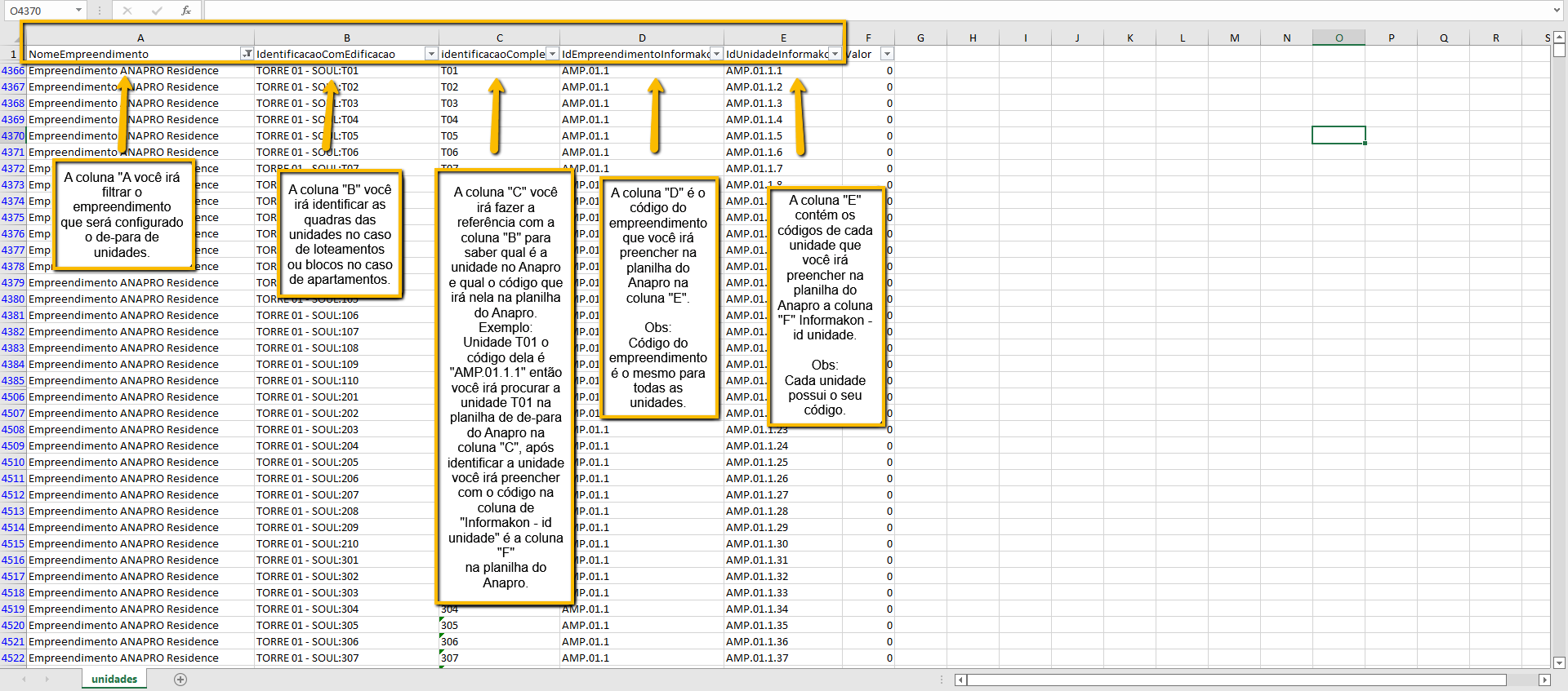 Primeiro print é referente a planilha do ANAPRO, segundo print é referente a planilha gerada conforme o passo "1" com as informações do Informakon.
