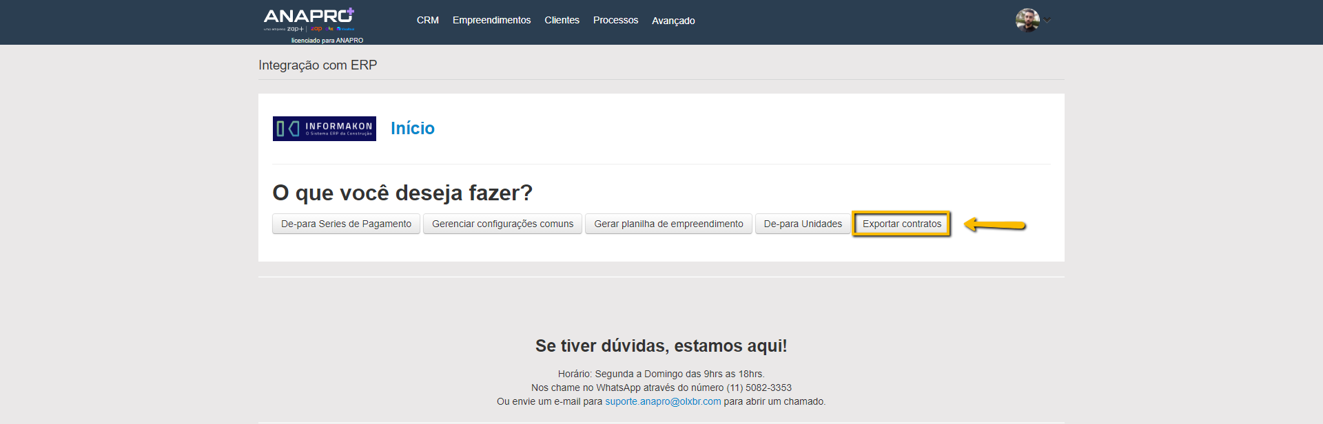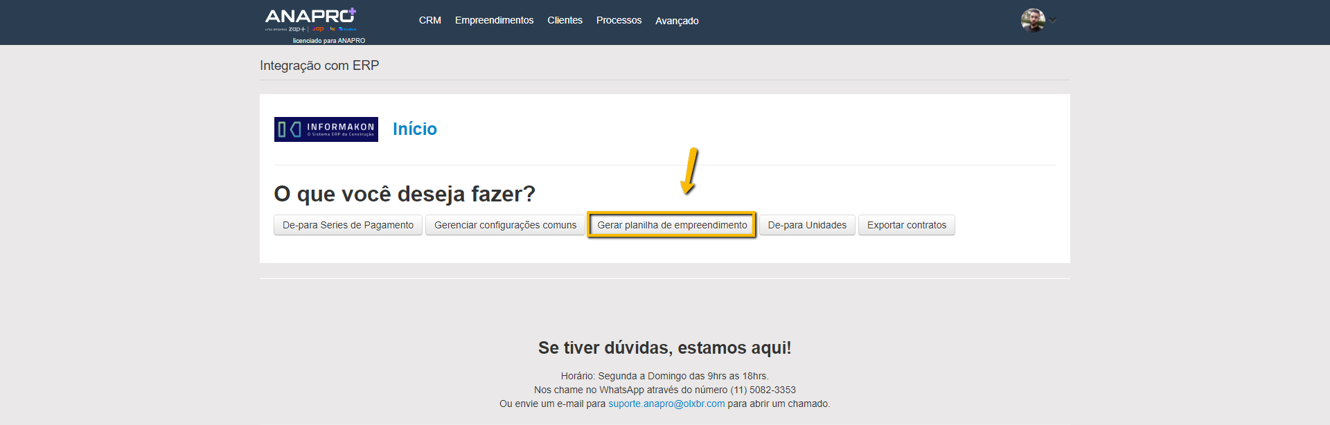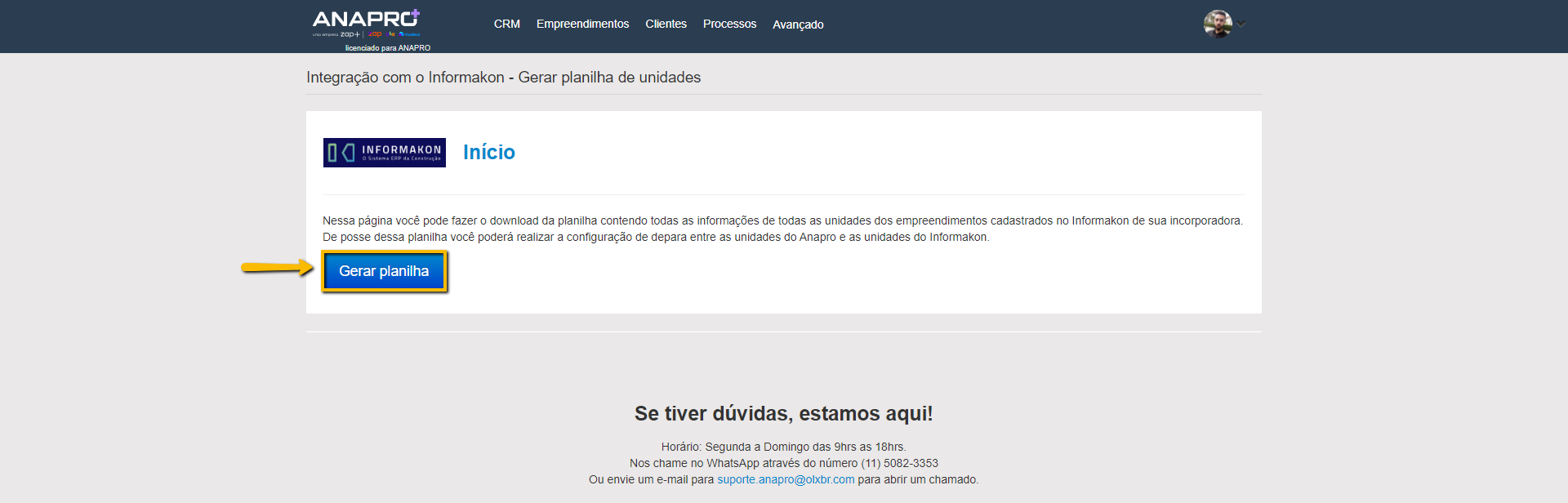 1 - Na tela de configurações da integração, é necessario gerar a planilha que irá extrair da base do Informakon do cliente uma planilha com todos os empreendimentos e informações necessárias.