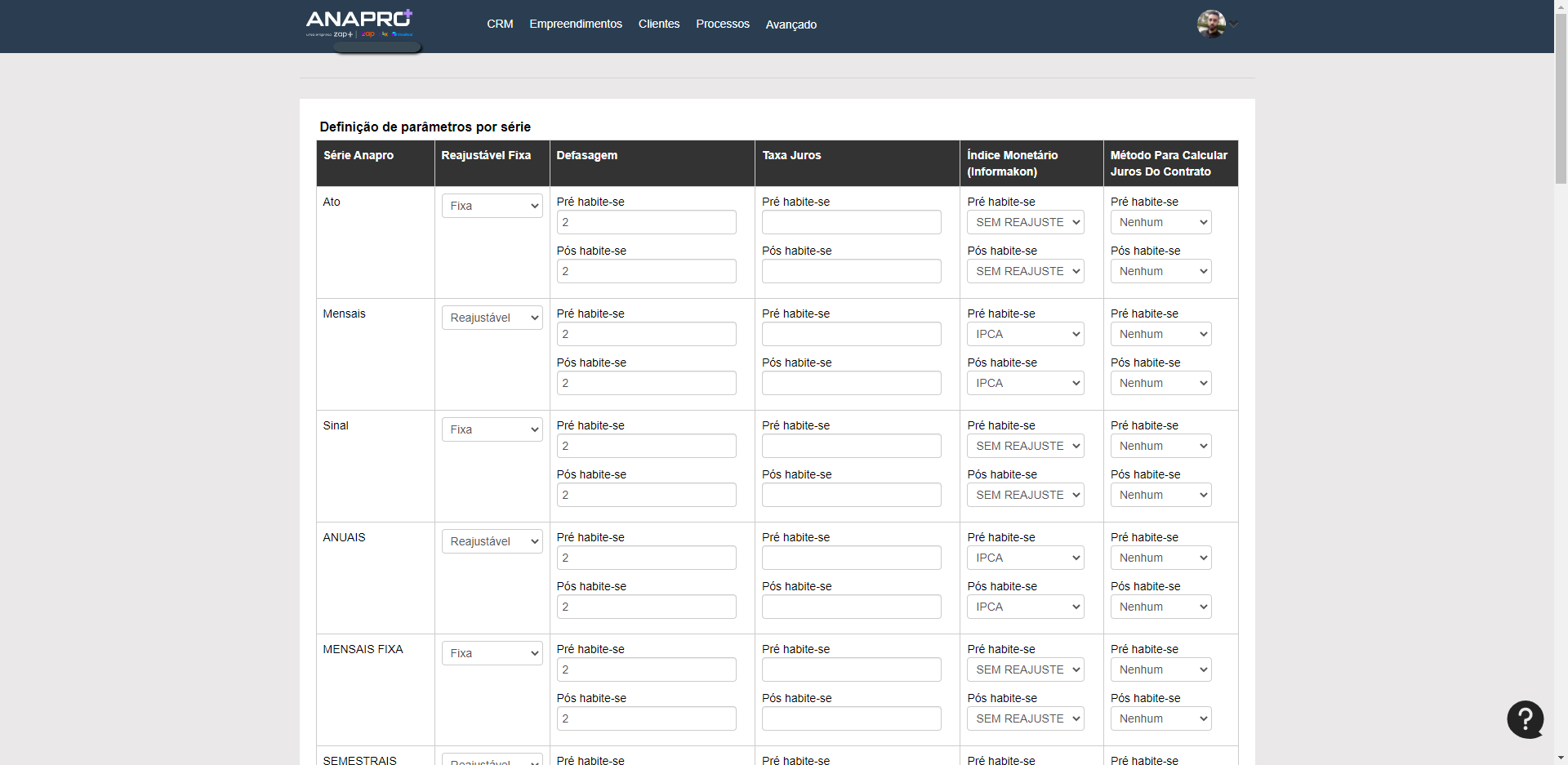 Nas configurações comuns você irá definir alguns parâmetros para as series, como "Reajustável/Fixa, Defasagem, Índice Monetário, Método Para Calcular Juros Do Contrato". Essa configuração ela pode ser feita uma por empreendimento, caso cada empreendimento tenha sua particularidade, ou apenas uma configuração que sirva para todos os empreendimentos.