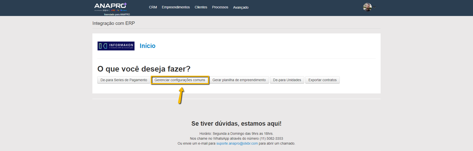 1 - Acessar o painel de integração no anapro conforme já foi orientado nas etapas anteriores e clicar em "Gerenciar configurações comuns".
