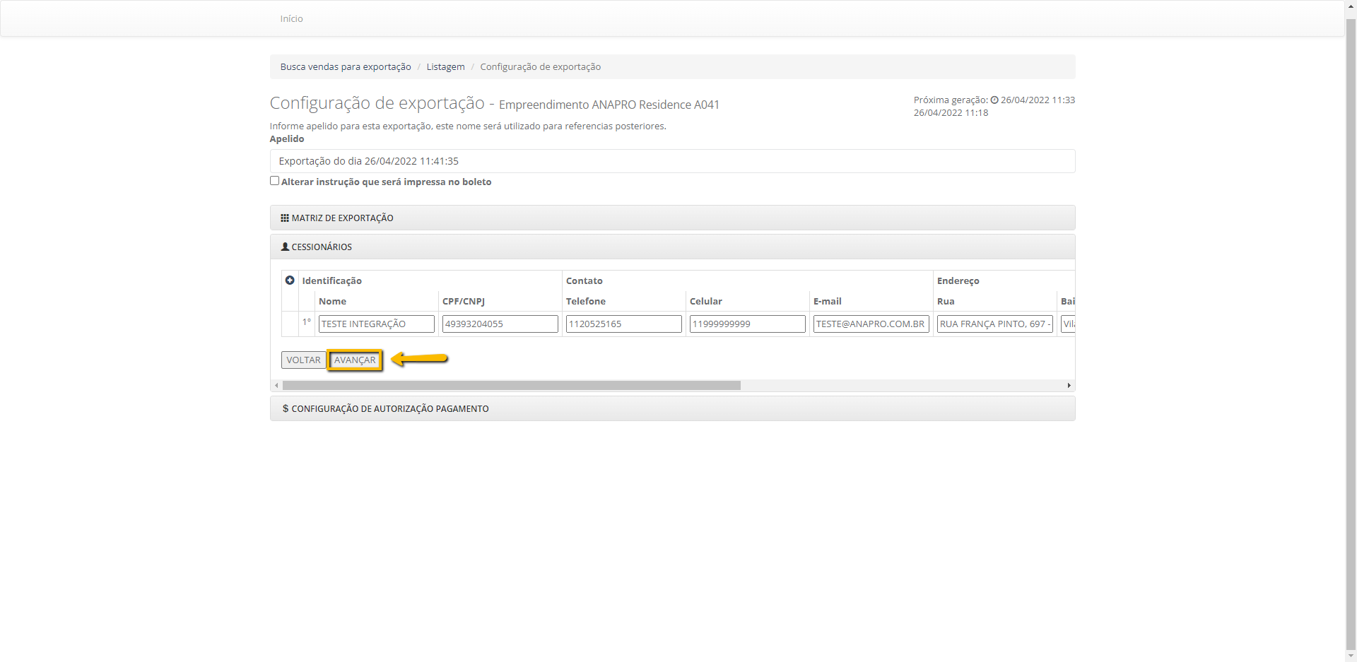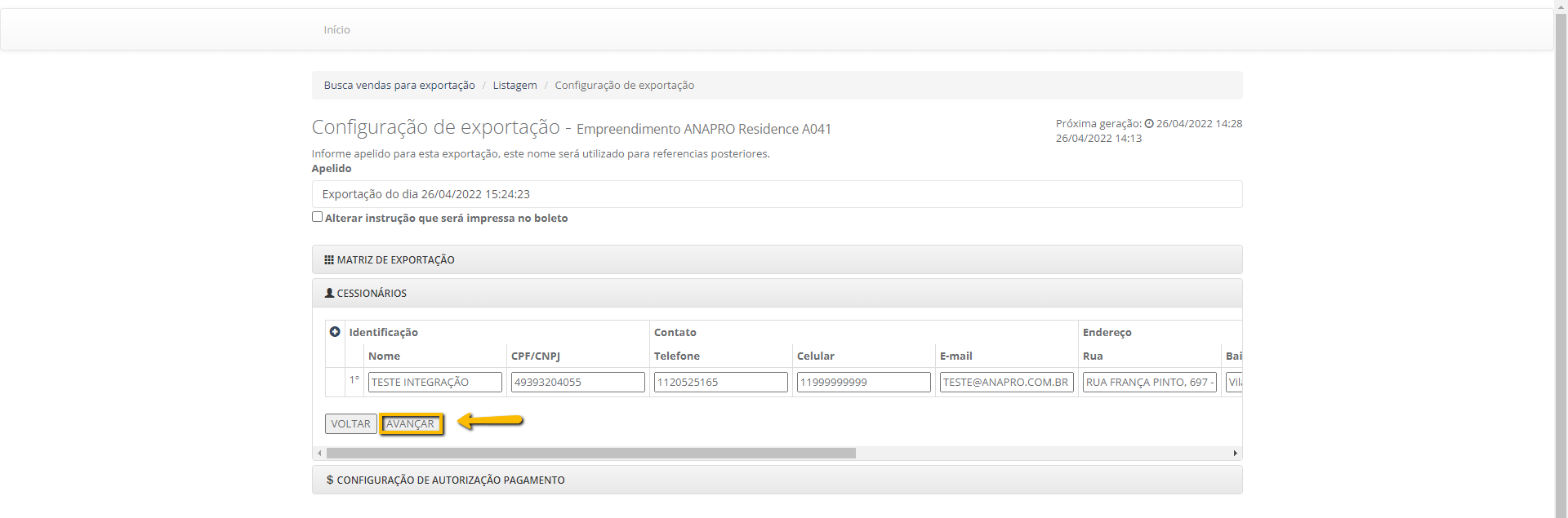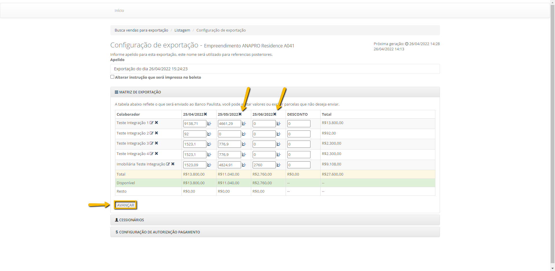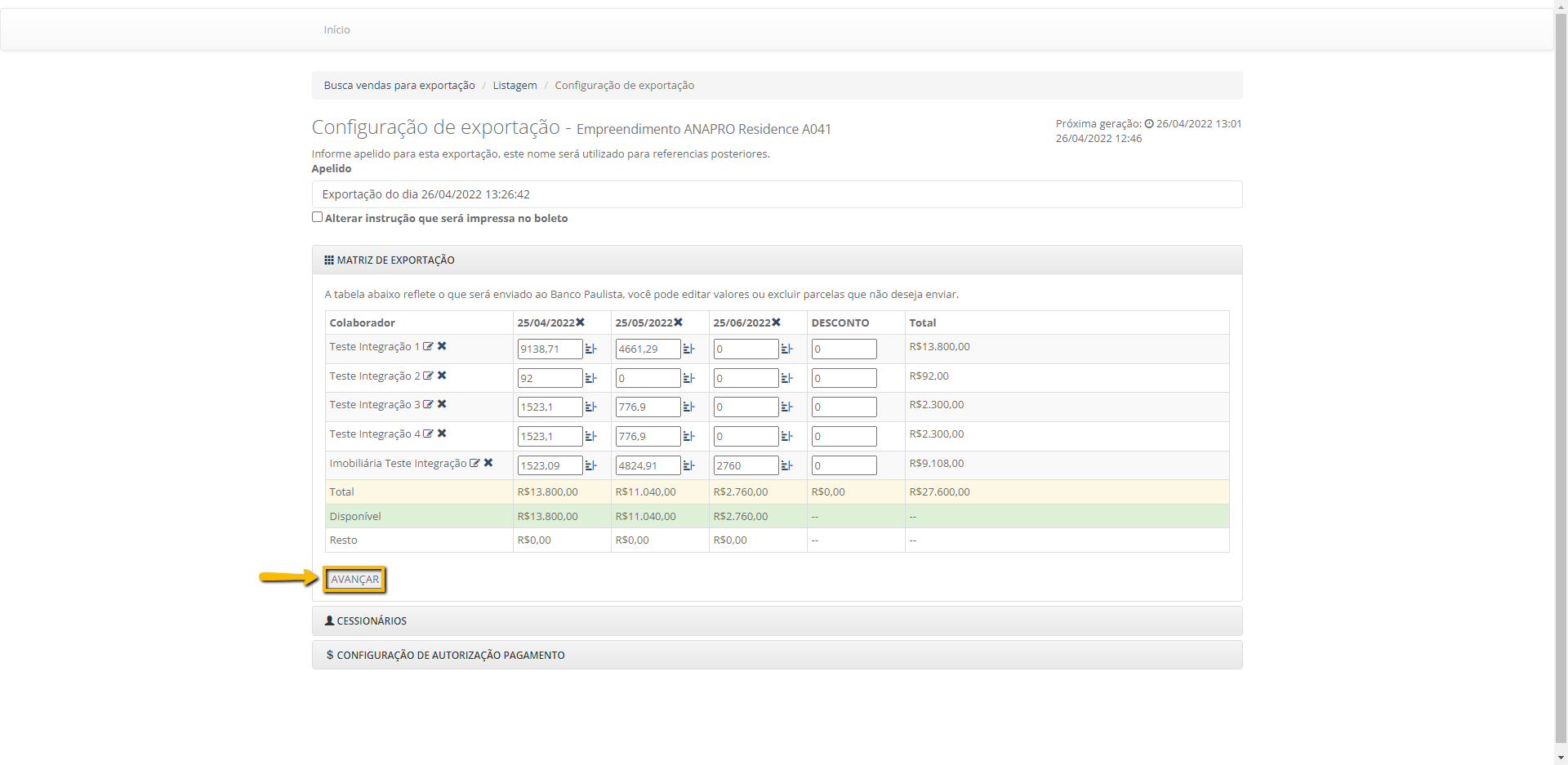 - Após clicar em "Nova Exportação" será aberto a seguinte tela conforme a imagem abaixo com a distribuição dos valores que cada favorecido irá receber e as parcelas com as datas de vencimentos. Depois de checar essas informações você irá clicar em "Avançar".
