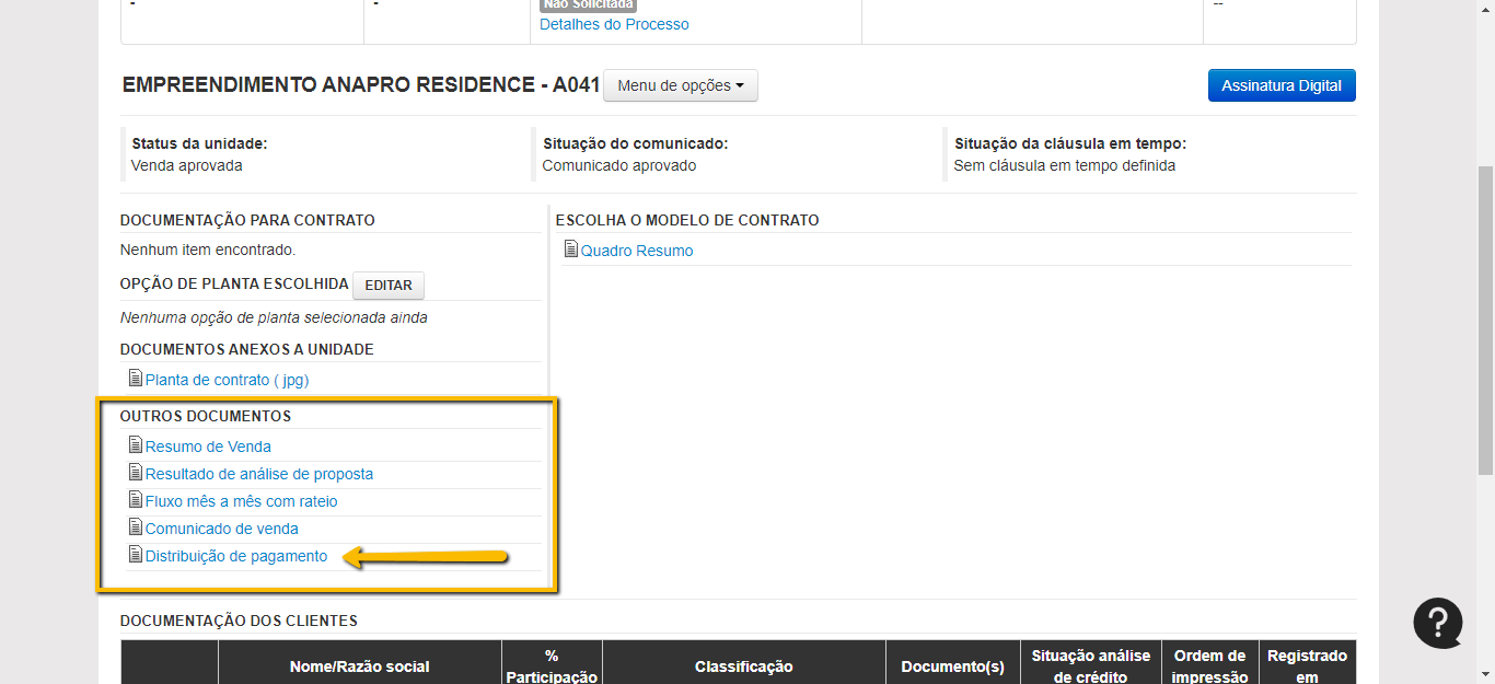 Na tela de "impressão de documentos" que é quando a venda está com o status de "Venda Aprovada" no canto inferior esquerdo tem uma área "Outros Documentos" conforme print abaixo, terá um documento "Distribuição de Pagamento". Esse documento significa que a distribuição de pagamentos dessa venda já está definida, clicando nele irá abrir a "Memória de Cálculo" conforme marcado na segunda imagem será descrito os favorecidos dessa venda e as suas comissões.