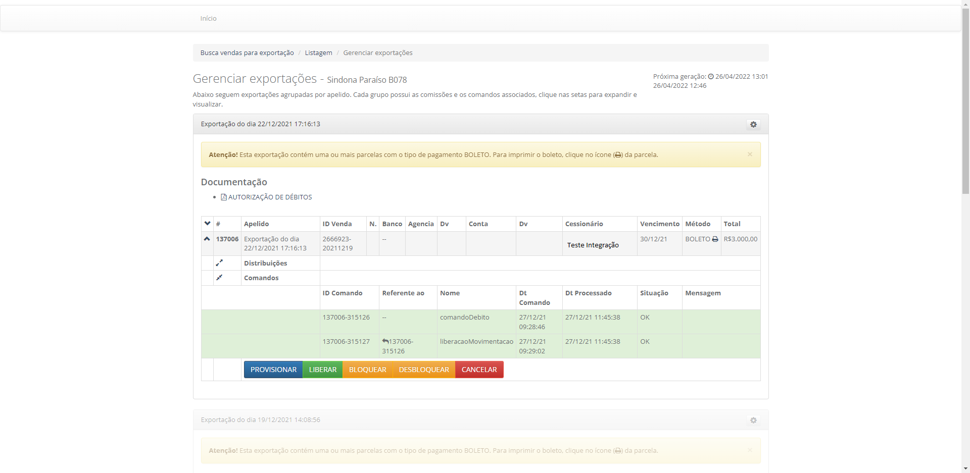 - Após clicar em "Salvar" juntamente com a opção de "Enviar provisionamentos para pagadoria" selecionado, irá abrir outra tela com a exportação criada. Nessa exportação é enviado os boletos para o email do cliente, e todos os dados daquela distribuição são enviados para a pagadoria a partir do comando "comandoDebito" que estará com a situação "Aguardando", esse status é aguardando o processamento do Banco Paulista, após o processamento ele ficará com a situação "OK", que significa que a pagadoria processou aquele comando.